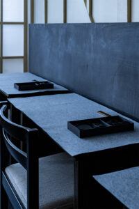 フィッティングルーム内は、柔らかく包み込まれるような広々としたスペース。壁紙に使用された伊予(愛媛県)産の手漉き和紙「宇和泉貨」に、当社が後処理で不燃化の加工をしました。「宇和泉貨」は、ふっくらと厚く丈夫なことが特徴の和紙です。