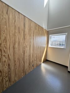 施工時は裏打ち紙を使用せず、壁全面に水性系塗料であるAEP塗装(白)を施し、不燃化した和紙を上から貼っています。