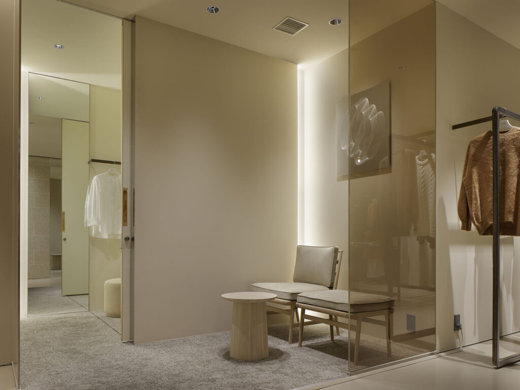 商業施設内など、建築上の内装制限がある場所に、温かみのある不燃和紙を活用することで、自然と調和する空間が生まれます。今回、施主様の「白く柔らかな和紙に包まれたシームレスな空間の中で、リラックスしてお客様にお洋服を試して頂きたい」という思いから、壁面と建具に同じ素材を採用いただきました。