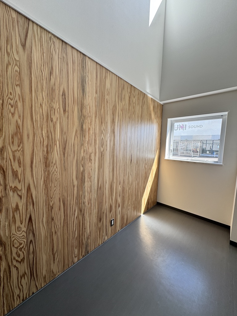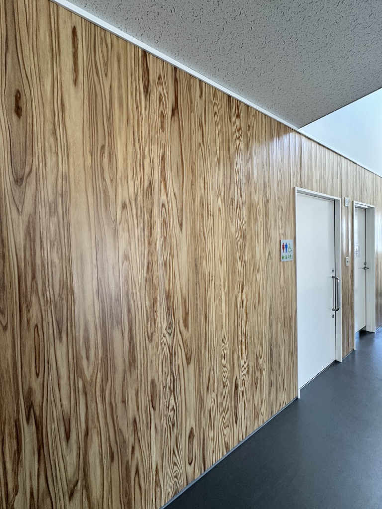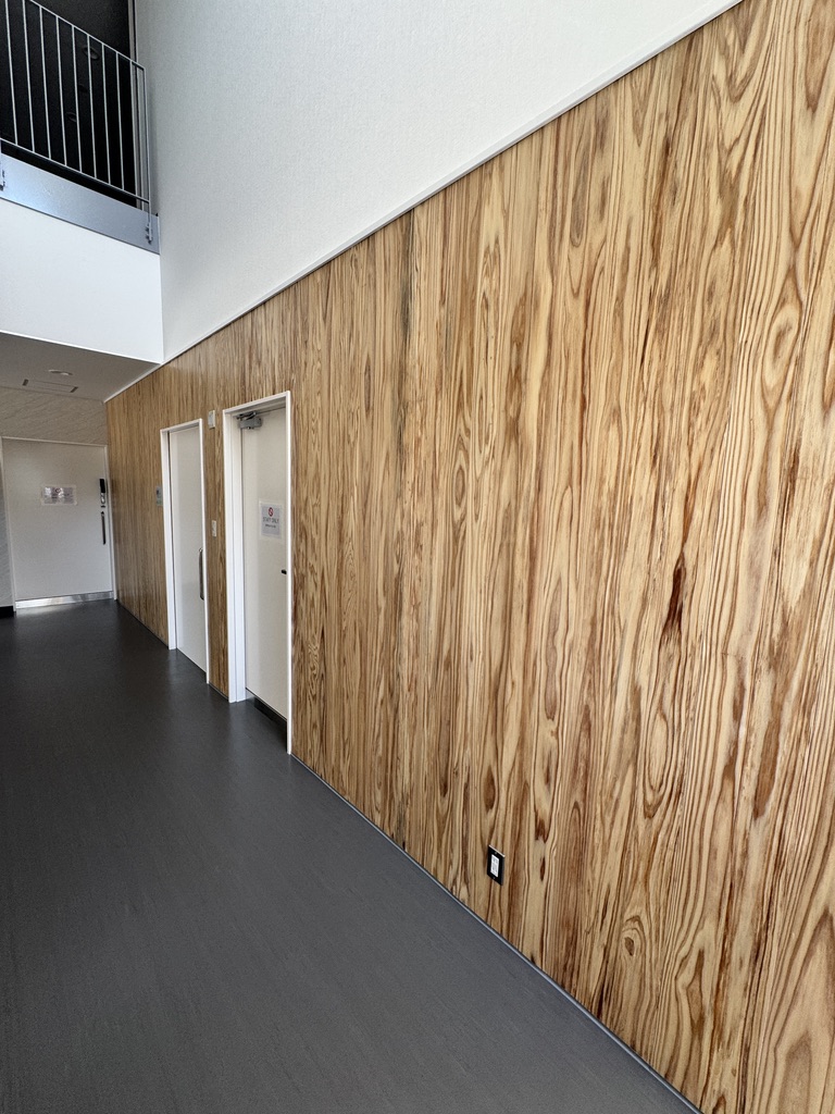 また、福井県福井市の消防署の壁にも採用いただいております。直線的な建築空間の中で、木のやわらかな模様がアクセントに。本物の木だけが持つ温もりを残しながら、安心して安全に長く使える空間を実現しました。