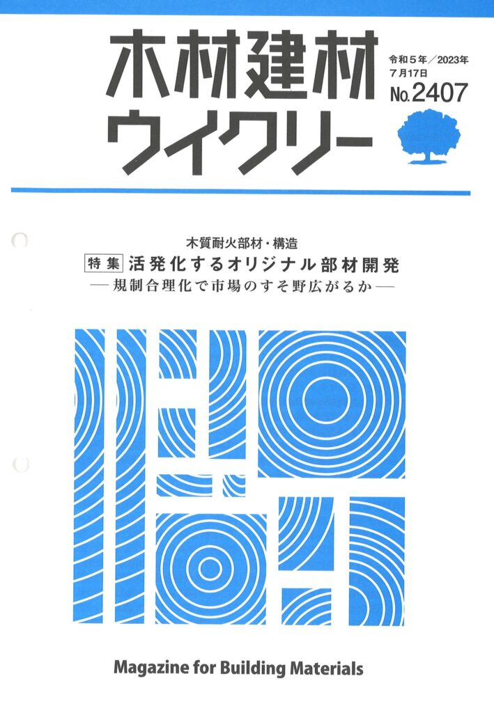当社の「セルフネン耐火木材」について、日刊木材新聞社より発行されている木材建材ウイクリー(2023年7月17日発行)に掲載されました。特集「木質耐火部材・構造 活発化するオリジナル部材開発」の中で、紹介いただきました。