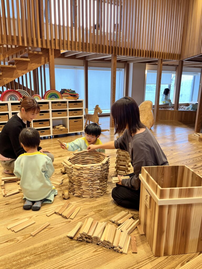 福井佼成幼稚園(福井市)で行われた贈呈式には、5歳児クラスの園児が参加し、専用木箱に入った500個の積み木が手渡されました。園児の皆さんは無垢の木のぬくもりを感じながら、嬉しそうに手にとって、遊んでいたそうです。