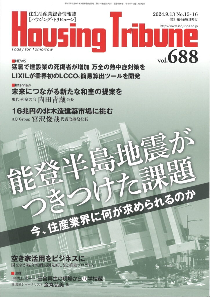 硬質ウレタン断熱材の表面に不燃木粉をパックして塗布することで、国土交通大臣「不燃材料」認定の性能基準を確認した当社の技術について、住生活産業に関する総合情報誌「HousingTribune (vol.688/2024年8月9日発行)に掲載いただきました。
