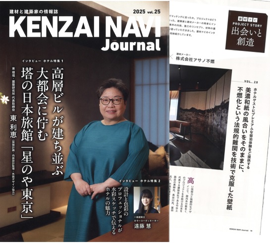 本誌の「PROJECT STORY~出会いと創造」内で名古屋にオープンしたホテル客室内にご採用いただいた「セルフネン不燃和紙」について特集されております。地元の名品である美濃和紙を内装材の客室壁紙として使用するため、法規的難関をクリアし、不燃化実現までのストーリーが紹介されました。本特集は、建設会社様とメーカーの間で生まれた共同プロジェクトについて、出会いや採用に至った決め手、施工時に直面した課題などを深く掘り下げたスペシャルインタビューとなっています。